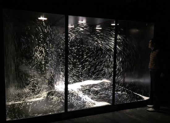 Part scientific-model, part black-box theatre, A Hierarchy of Eddies is an art-science experiment in staging the phenomenon of turbulence. Comprising two axial fans and ten litres of polystyrene balls enclosed in a chamber, this kinetic work enacts a constantly changing system, analogous to fluid flows everywhere: from inside our bloodstream, to rivers, tornadoes, rising smoke from a cigarette or cyclones on the surface of Jupiter. Framed by a proscenium, the moving balls act like pixels, drawing the currents of air as they circulate the chamber. Their actions reveal how higher levels of energy within the large-scale swirling structures, cascade into smaller and smaller scale structures. This dissipation of energy creates what is known as ‘a hierarchy of eddies’. A hallmark of turbulence, eddies (also known as vortices or whorls) can form in unpredictable ways, so much so that turbulence is considered one of the greatest mysteries of science. A Hierarchy of Eddies invites audiences to keep pace with these mesmerising patterns as they form, collapse and reform.