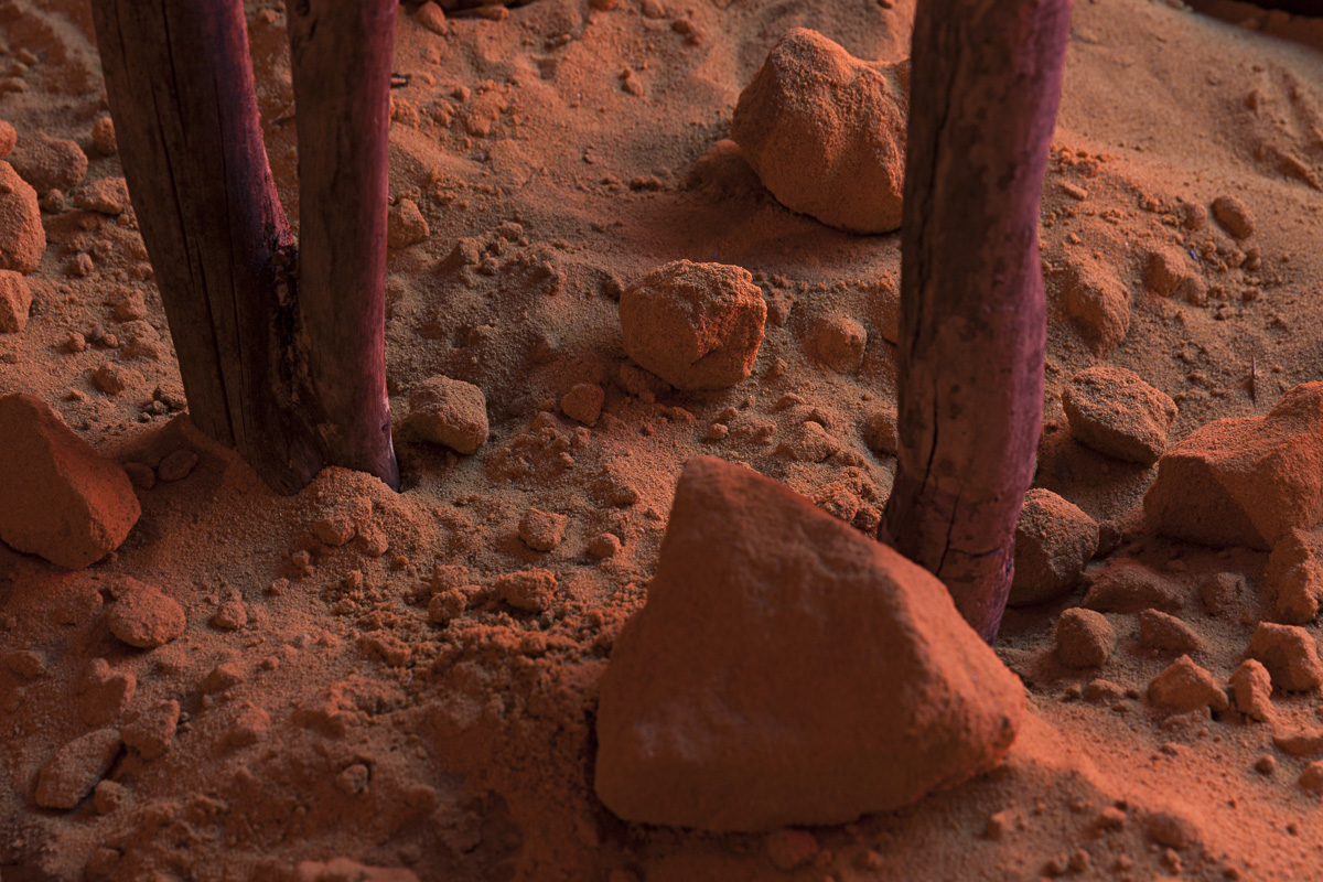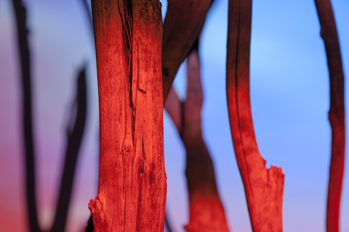 This work evokes the spirit of my Ancestors and draws on the traditional mourning practices of the past to tell new stories about the history of Aboriginal resilience in southeast Australia. The viewer can see, hear and feel my story, which challenges notions that Aboriginal people from southeast Australia are no longer here. The work is one of juxtapositions, as I move from the past to the present, standing strong on the Country of my Ancestors to reveal contemporary representations of who I am and where I come from. Branches from along the Murray River frame my story, offering a natural element from my Ancestral lands, in contrast with the artificial video installation. All these elements together provide another lens through which to view the many different ways of being Aboriginal. As Aboriginal people we are connected to place, yet we may live away from place; we are connected to stories and people from the past, yet they continue to resonate in our lives today. All these things and more inform my work, as I create and reclaim my cultural heritage as a contemporary Aboriginal artist.