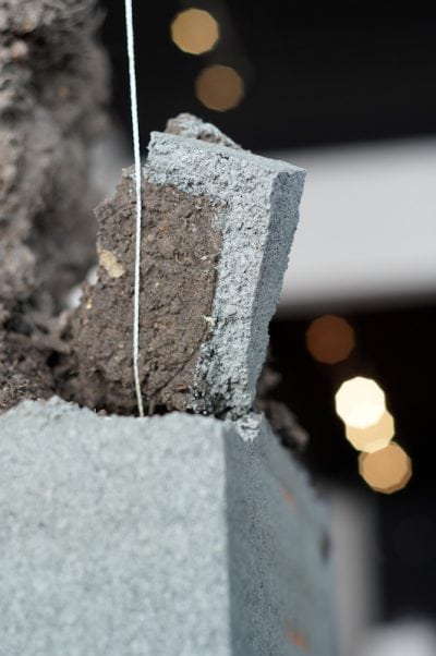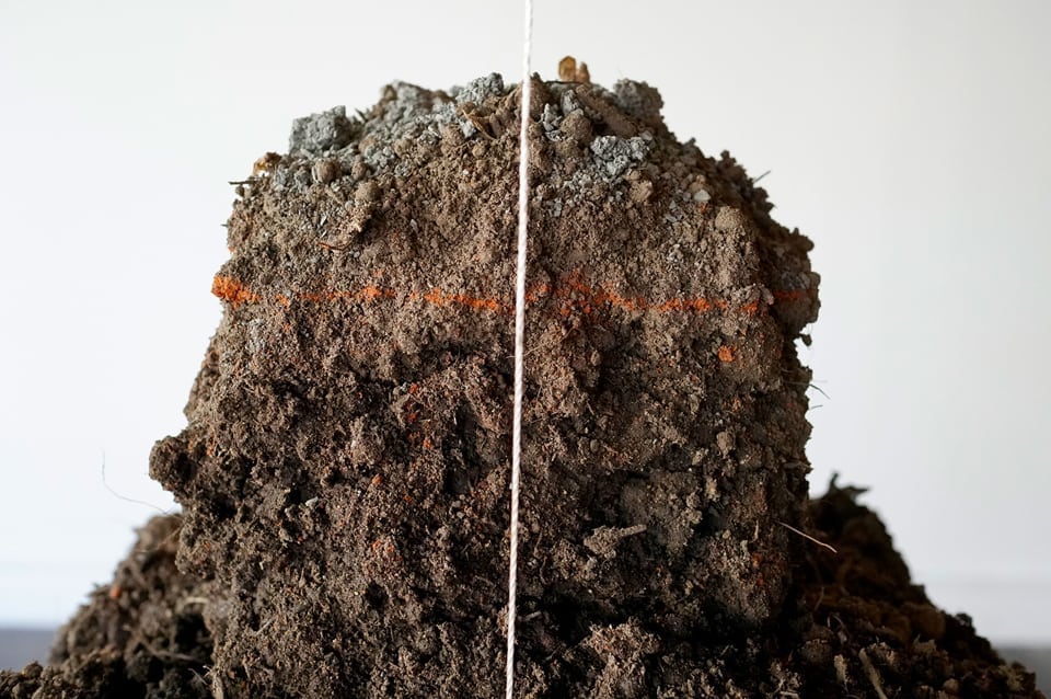 Over the course of the exhibition the stratification of local soils, unnaturally placed in a vertical column, is eroded or re-placed as its restrictive binding is slowly pulled out, releasing the layers of different soil structures back to a natural form. This repositions the displaced, previously stratified layers of soils to create a new landscape on the horizontal surface below.