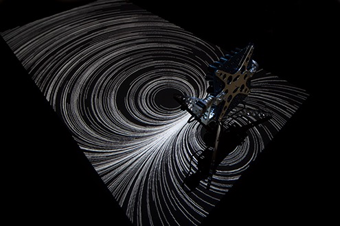 Curious Tautophone – Tensor Field Ontology is ultimately about the concept of lenses and focusing. The robot controls a sound beam and sculpts the projection of a vector field, creating an audible and visual environment. Normally sound is intangible and the forces of electromagnetism are invisible. The unusual nature of hearing focused sound can be experienced as something unnatural and evokes a sense of uncanniness in the human observer.