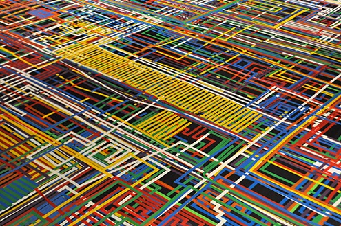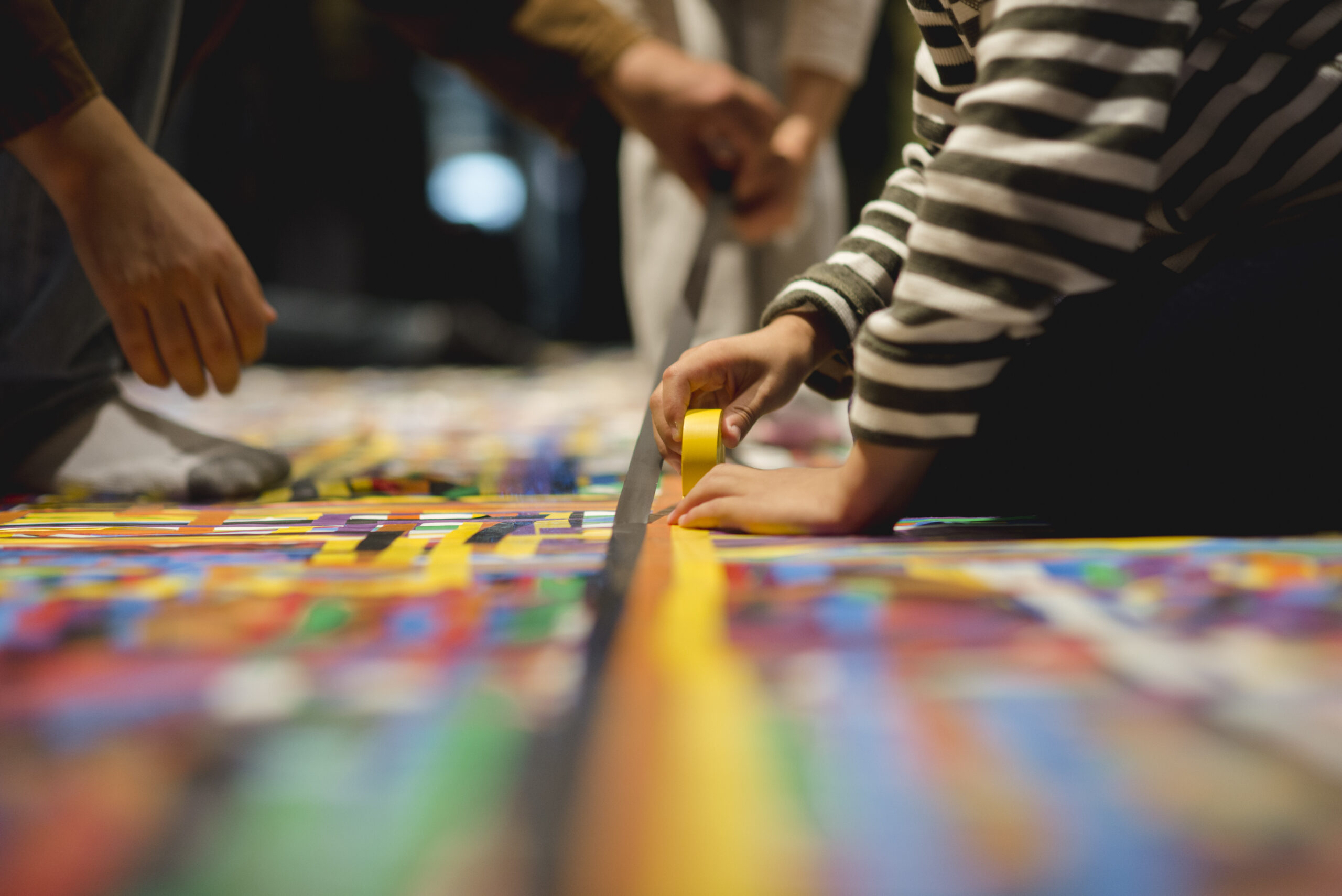 Drawing on Complexity (Experimenta Series) takes the form of a series of collaborative, rule-based artworks, enacted over the course of the Triennial. Part of a larger investigation into pattern formation, the works compare what emerges when different groups of people make a drawing together within a similar set of parameters. These parameters include using electrical tape as a medium, using the same sized area of floor as a drawing surface, running the session for the same number of hours, and working with the same set of compositional rules for individual and collaborative mark-making. The groups are sourced by participating galleries for each exhibition.
