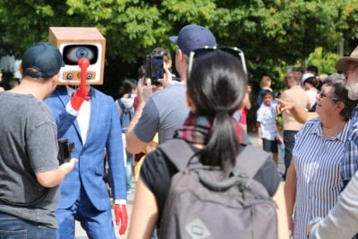 Always connected, yet somewhat separated from the world around them, these performing robotic sculptures use dark humour and absurdity to reflect and highlight the growing obsession with online personas and the technology that draws our attention from dawn to dusk.